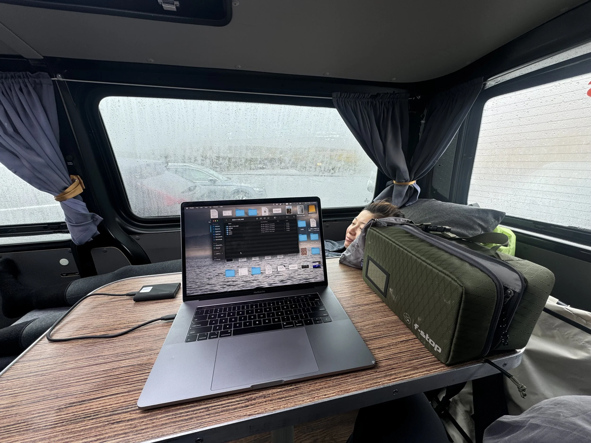 Dining table folds down into a huge double bed, being 6 foot 4 this was a bonus, having a work station for editing on the go also helps on the wet days! Drone case: f-stop